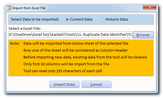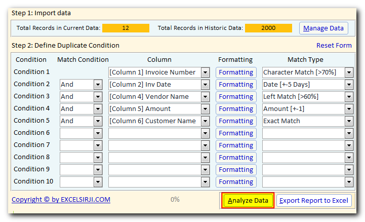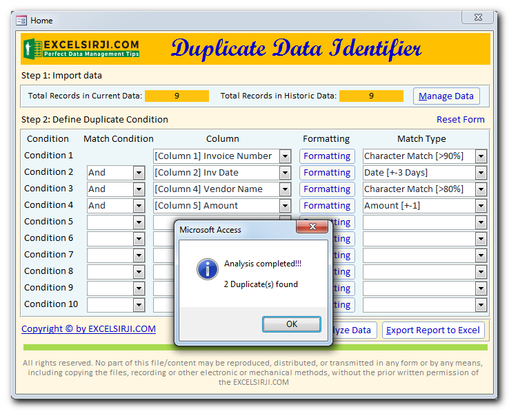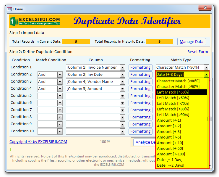 Duplicate Data Identifier is an MS Access based tool which helps to identify duplicates from any Excel based data. The tool supports up to 10 conditions and 25 types of matching conditions to find the exact duplicate. You can also define formatting conditions to first format the data before checking for duplicates.
