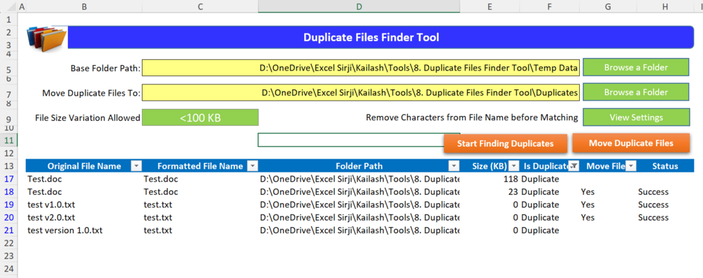 Duplicate Files Finder Tool is an MS Excel based tool to identify duplicate files exist in your system or shared folder. The tool takes a base folder path as input and list down all duplicate files in the folder and sub-folders. It has capability to find duplicate files by comparing the names and their size.