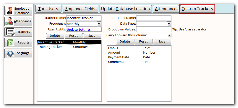 Employee Database is an MS Access based tool to manage employee details. The tool supports upto 78 demographics for each employee such as Name, Location, Phone, Email, Address etc. The tool also comes with inbuilt attendance tracker to track daily attendance of employees. Over and above this, you can also design your own trackers and start using it.
