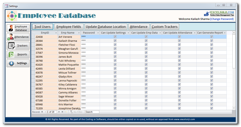 Employee Database is an MS Access based tool to manage employee details. The tool supports upto 78 demographics for each employee such as Name, Location, Phone, Email, Address etc. The tool also comes with inbuilt attendance tracker to track daily attendance of employees. Over and above this, you can also design your own trackers and start using it.