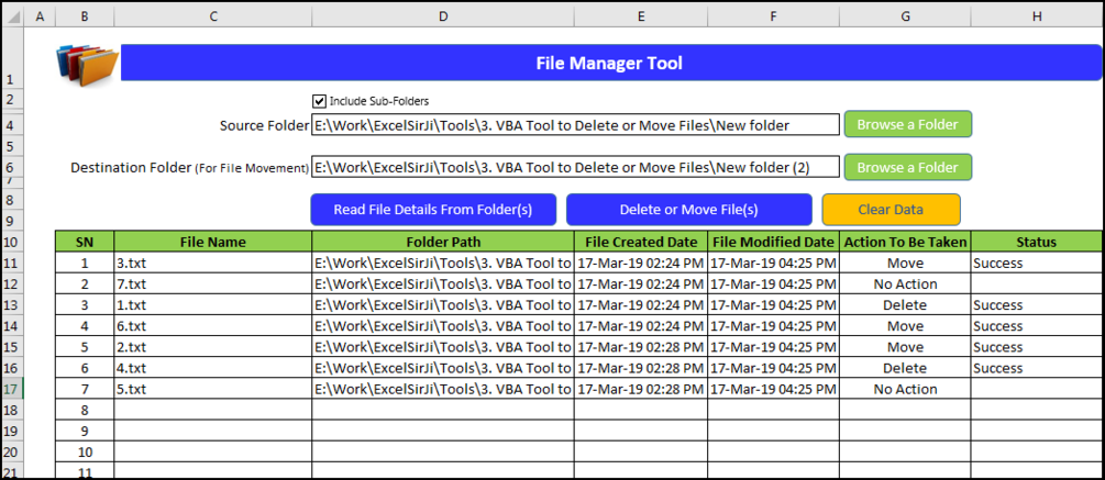 File Manager tool is an Excel based tool which helps you to delete or move unwanted files from your system. It requires a source and destination folder (in case you want to move files). First it lists all the files available in the folder or sub-folders then you can select the action to be taken for each file such as Move or Delete. With a click of button, tool will take all necessary actions.