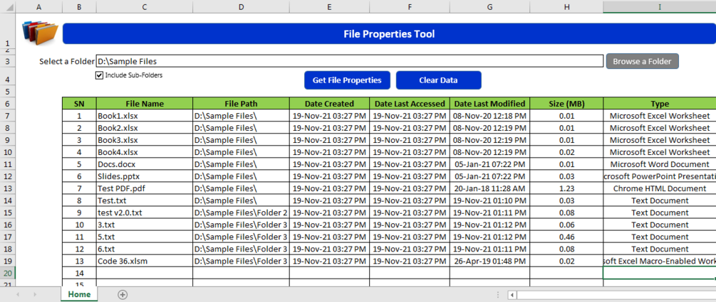 File Properties Tool is an MS Excel based tool which helps you to get File Name, File Path, Date Created, Date Last Accessed, Date Last Modified, Size (MB) and File Type properties of the files. You just need to browse the folder where your files are and click on ‘Get File Properties’ button.